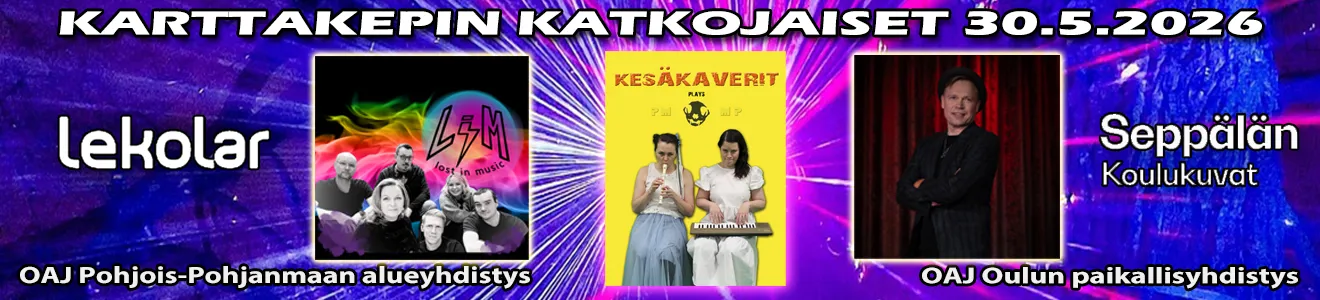 Opetusalan vuoden odotetuinta päätöstapahtumaa Karttakepin katkojaisia juhlitaan lauantaina 30.5.2026 Oulussa Radisson Blu -hotellilla. Kaikki alueemme kasvatusalan ammattilaiset ovat tervetulleita viettämään yhdessä alkavan kesän parasta iltaa! Mahtavien ihmisten, hellivän auringon ja alkavan loman lisäksi juhlan ohjelmaa täydentävät elävällä musiikilla Oulun alueen loisteliaat opettajataustaiset orkesterit Aki Mikkonen Band, karttakeppien konkariorkesteri Lost in Music ja Kesäkaverit. Illan tanssimusiikista vastaa DJ qke.